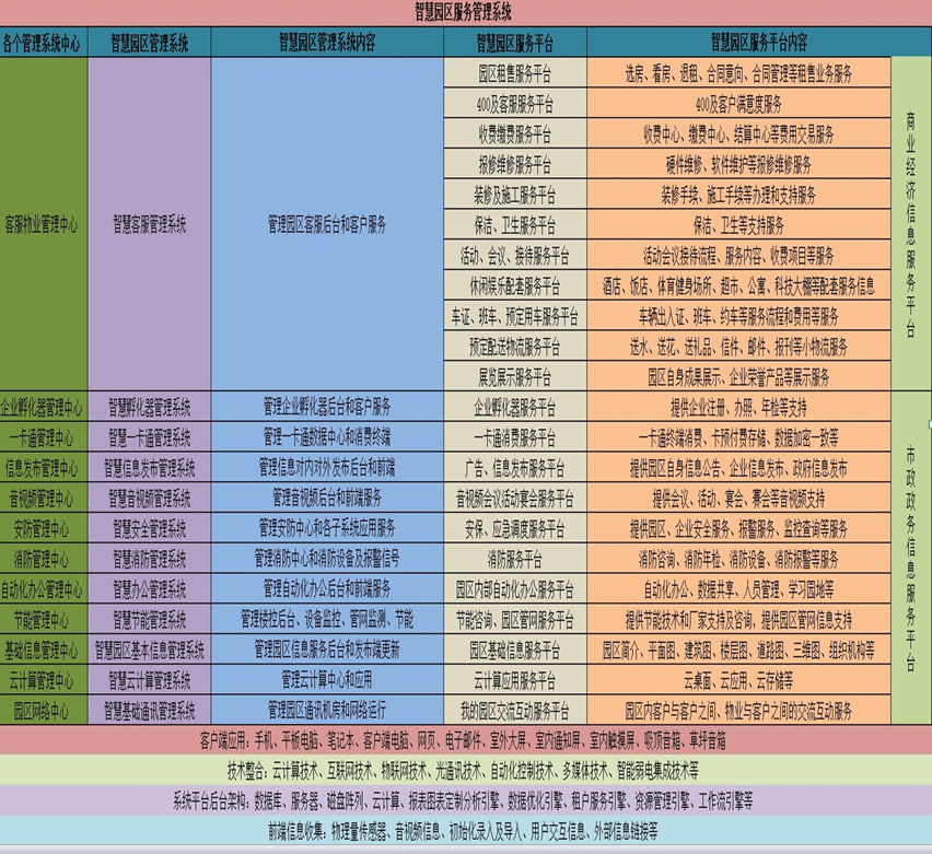 这样,对于一个现代化园区来说,智慧园区管理及服务平台,就是园区现代化管理的灵魂,平台整合园区所有的原有智能软硬件系统、建立统一的数据库,搭建统一强大的管理网络覆盖和服务器群组组成的平台,对提高管理效率、丰富决策依据、提高对园区企业的服务水平、加强园区企业和园区管理方的互动、促进园区更通畅的和周边社会、社区联接,展示、塑造、突出高科技园区形象提供强有力的支持。