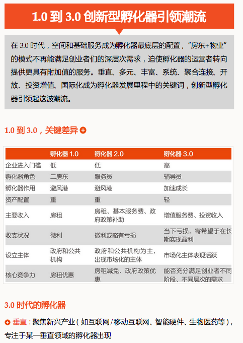 1959年,美国纽约贝特维亚。商人约瑟夫·曼库索(Joseph Mancuso)做出一个决定,将自己管理的一幢85万平方英尺的多层综合大楼分隔成小单元,出租给不同的小企业,并向承租企业提供融资、咨询等服务来促进它们的成长。此后5年,这个被称作贝特维亚工业中心的地方成功创造出了数以千计的就业机会。从大楼内一家养鸡企业活蹦乱跳的小鸡中得到灵感,曼库索将这种经营模式命名为"企业孵化器",于是,贝特维亚工业中心成为世界上第一个孵化器。此后,孵化器模式逐渐从美国扩展到全球各地。1987年,武汉东湖诞生了中国第一个企业孵化器。50多年过去了,虽然孵化器在语义上保持了相对的稳定性,但是,无论在美国还是在中国,孵化器的设立主体、实际运作模式等都发生了巨大的变化,从1.0步入了3.0的时代。我们能看到,最近一年,伴随"大众创业,万众创新"的热浪,创投界设立孵化器的热情甚为高涨,使得孵化器在数量上急剧扩张:孵化器的市场繁荣期来了。