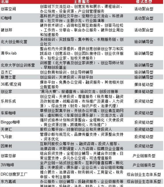 从业务模式和形态角度来看,目前吴国现存的众创空间主要存在以下几种模式