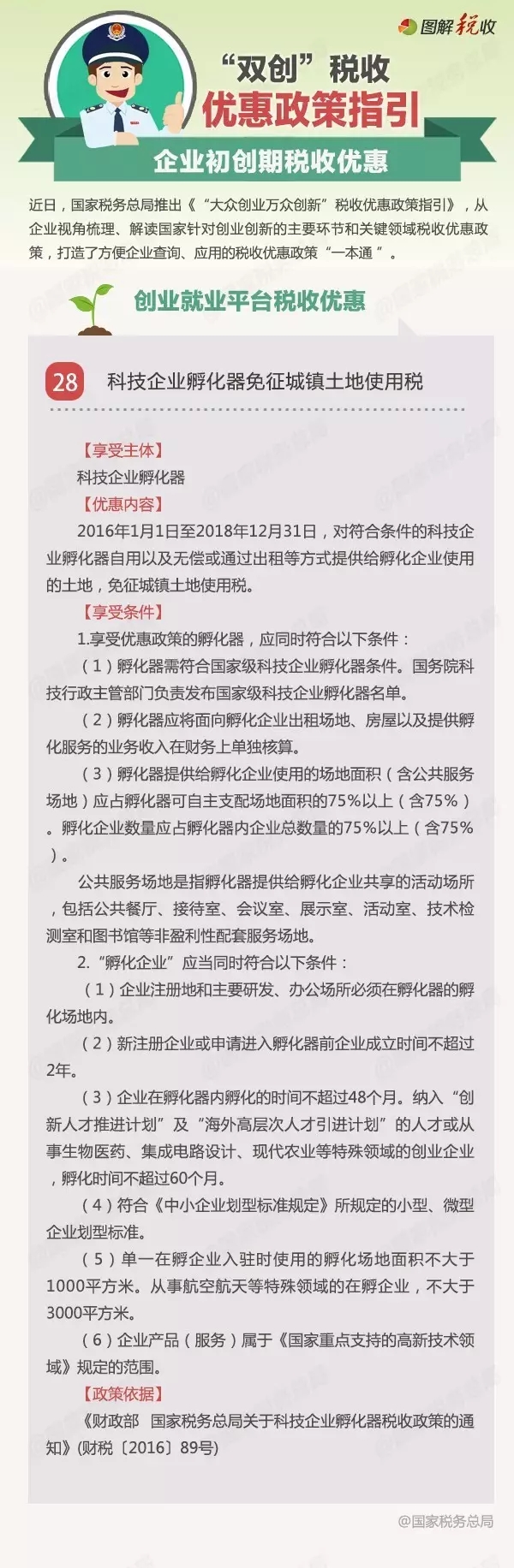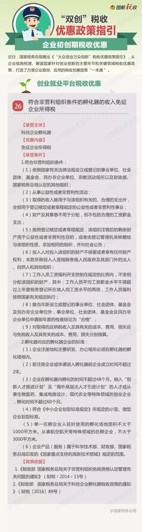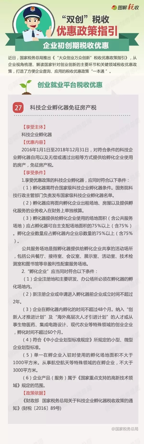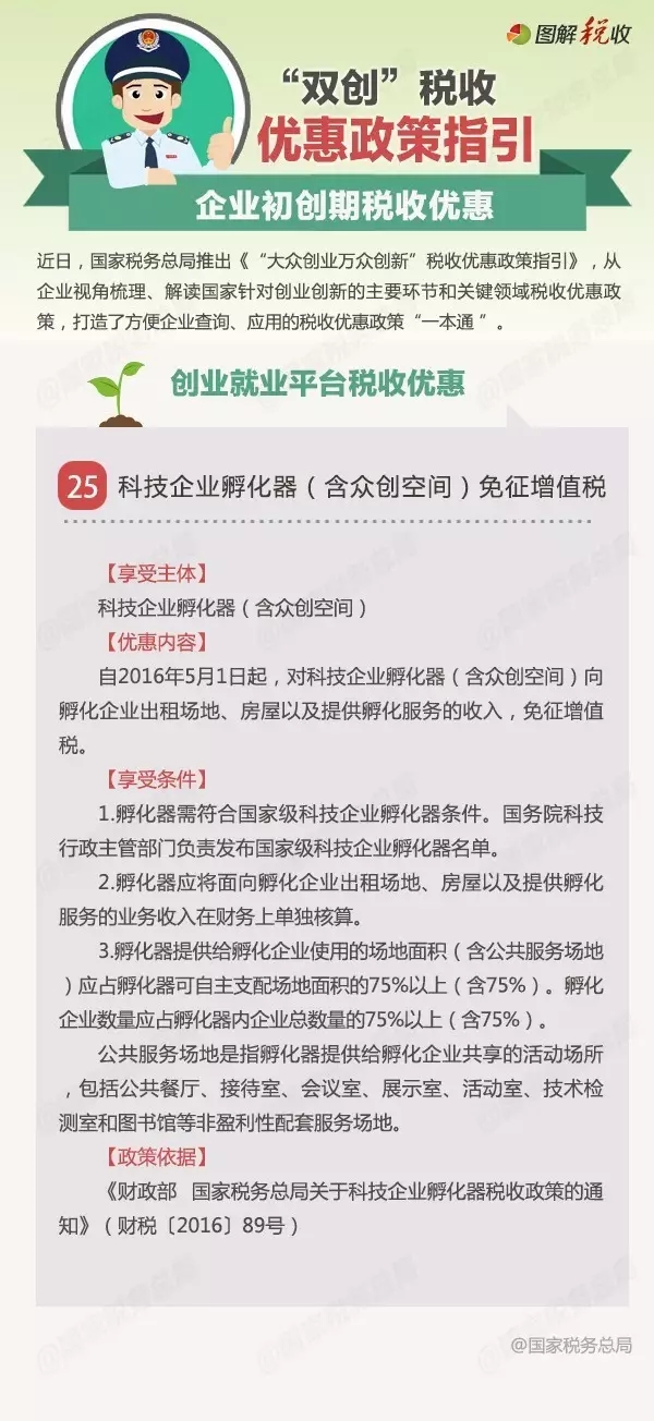 近日,国家税务总局推出《“大众创业万众创新”税收优惠政策指引》,将陆续编发税收优惠政策的具体内容。今天发布企业初创期税收优惠之重点群体创业就业税收优惠:科技企业孵化器税收优惠政策。